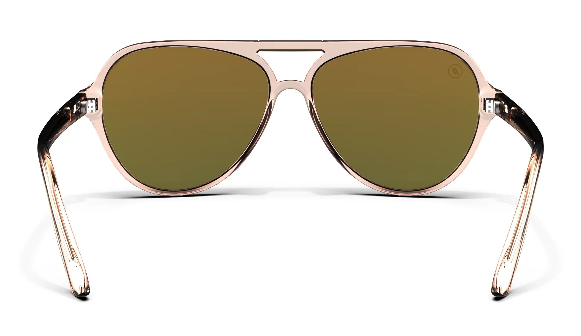 ‘Candy Cove’ and its crush-worthy colorway are here to mix a little magic into your day. The appeal here is very, very real, thanks to a semi-transparent rose frame with a visible silver-plated metal core at the temples for extra glam. The polarized pink lens complements this aesthetic perfectly, and the top bar frame adds an extra dose of distinction to these stellar sunnies. //