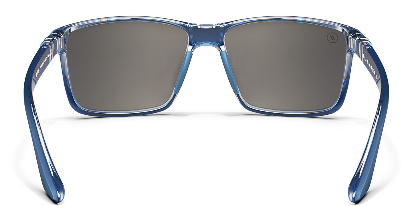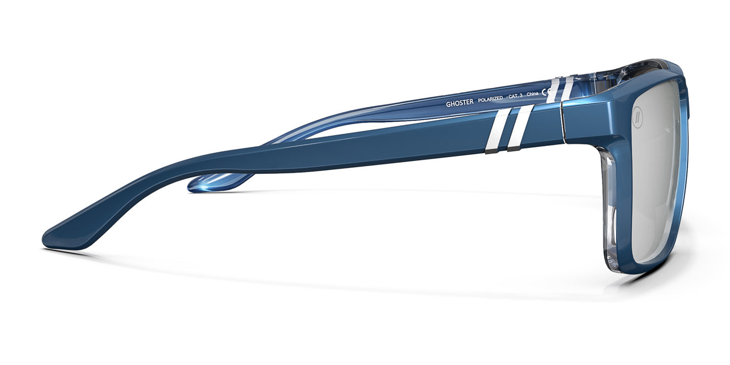 ‘Ghoster’ is spirited style that speaks to the soul of the adventurer. Silver mirror lenses flash with brilliance, enclosed by a metallic blue frame with an ethereal crystal clear interior and a high gloss finish for maximum effect-but that’s far from all. The sturdy frame was built for the great outdoors, and double-injection nose pads offer enhanced grip, providing peace of mind as you make the most of your time in the sun. //