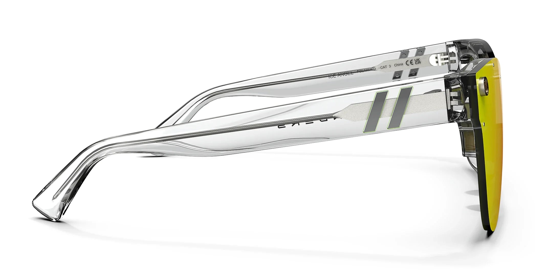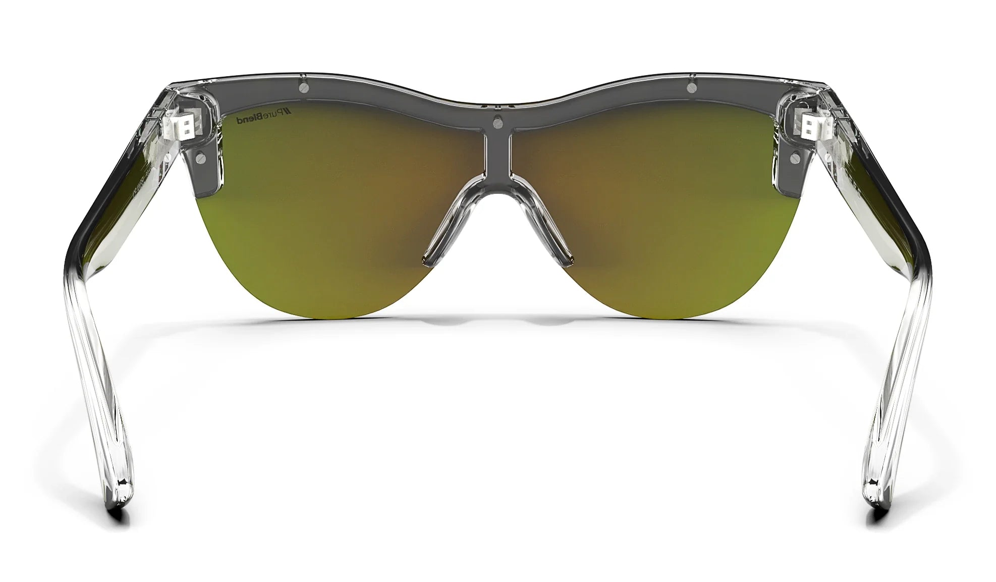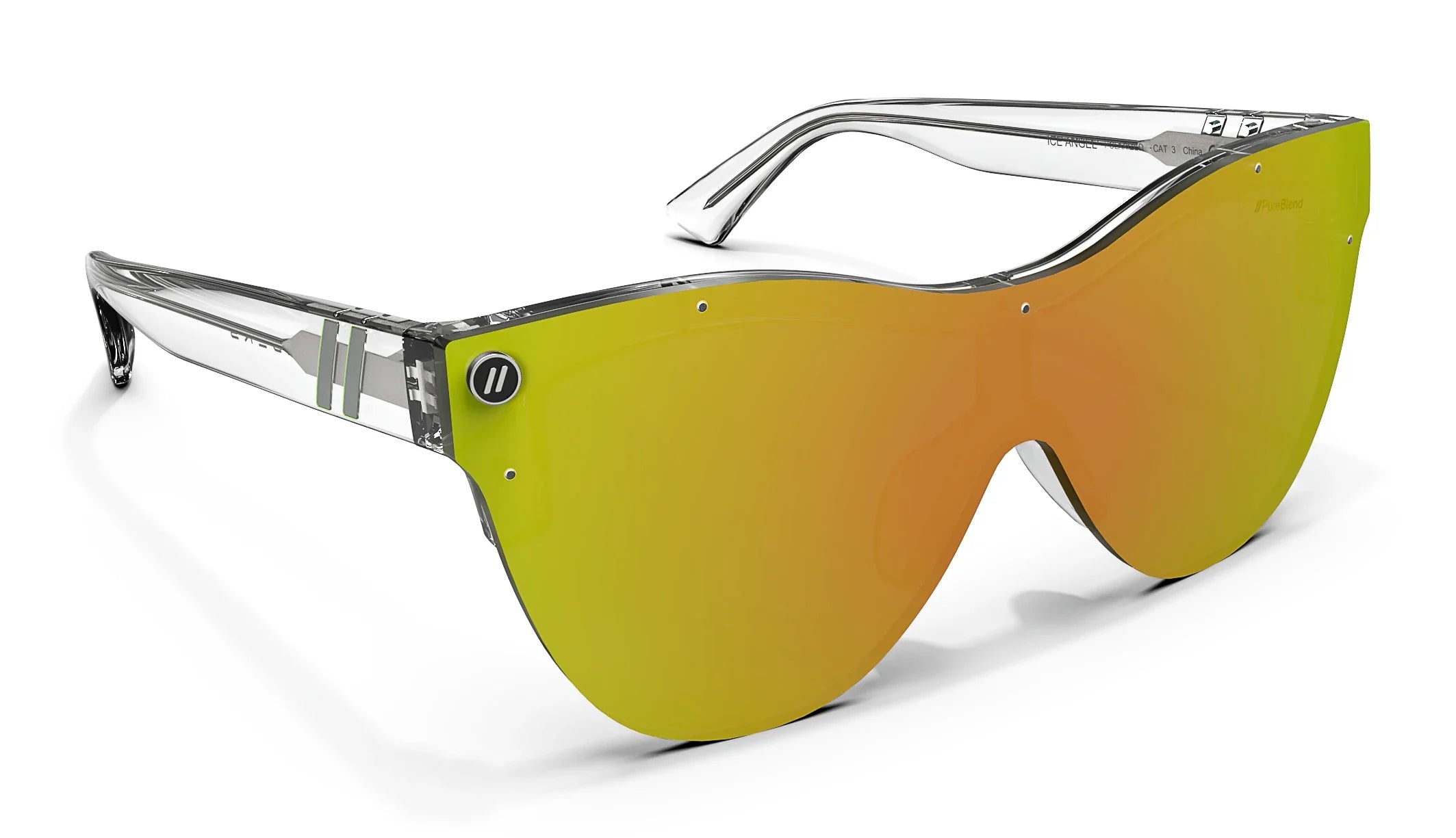 Divine design finds its home in ‘Ice Angel.’ These cat eye sunglasses from the ‘Alice Collection’ unite a rimless, single-lens design with an expressive color palette. The peach-lime gradient of the lens pops in contrast with the crystal-clear temples. Eye-catching detailing is also present throughout, with a silver-toned metal core and iridescent Life in Forward Motion stripes continuing the celebration of style. ‘Ice Angel’ is a spectacle of color and personality, available with your choice of a polarized PureBlend Lens. //