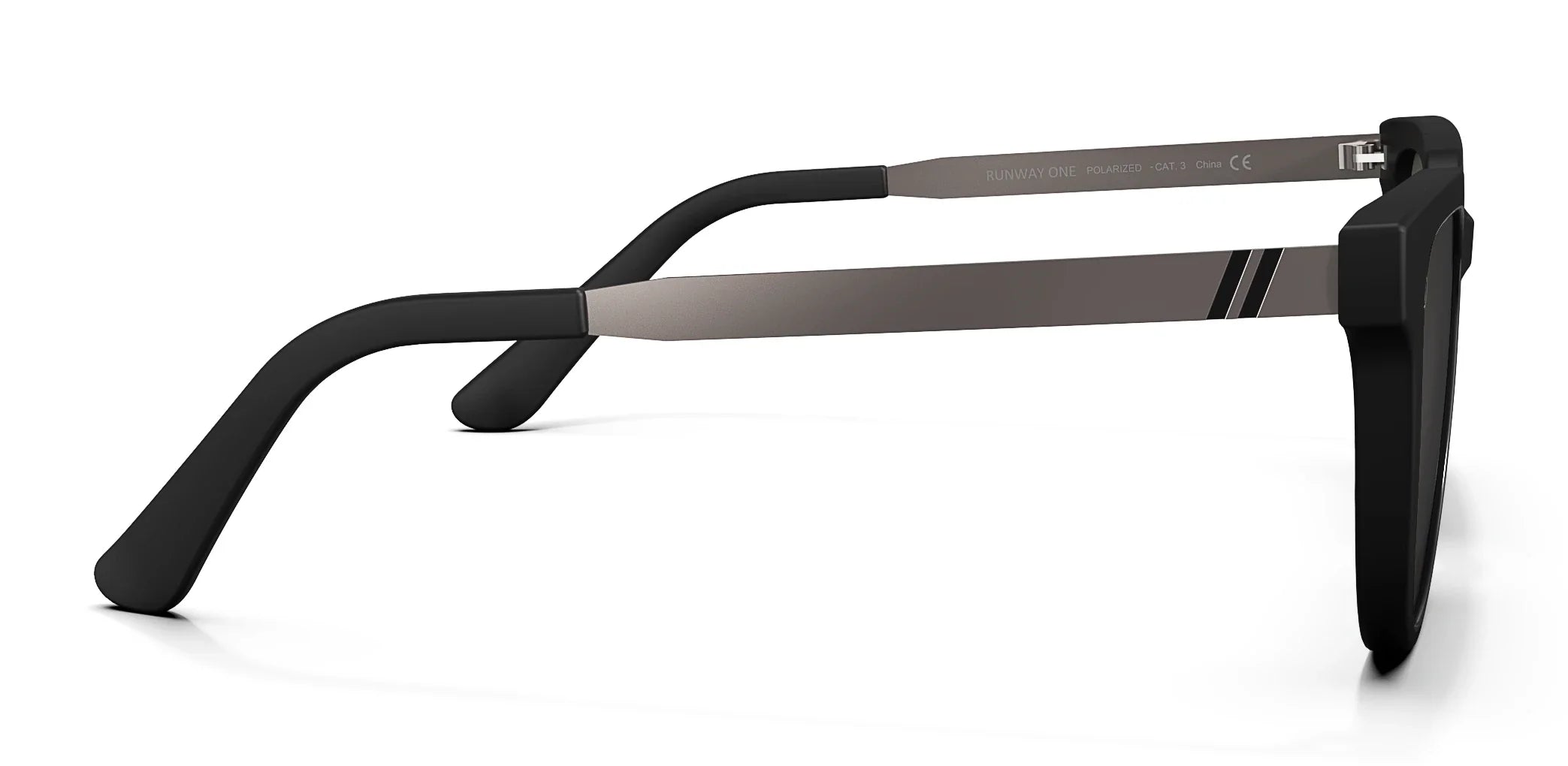 ‘Runway One’ offers a clean, casually inviting look-the type of colorway that’s so effortlessly simpatico with everything that it deserves a “standing o” for its style. It rocks out with a matte black frame, polarized smoke lenses, and the combination of satin-finished gunmetal temples and matte-finished black ear rests. Wear with confidence-and reap all the benefits. //