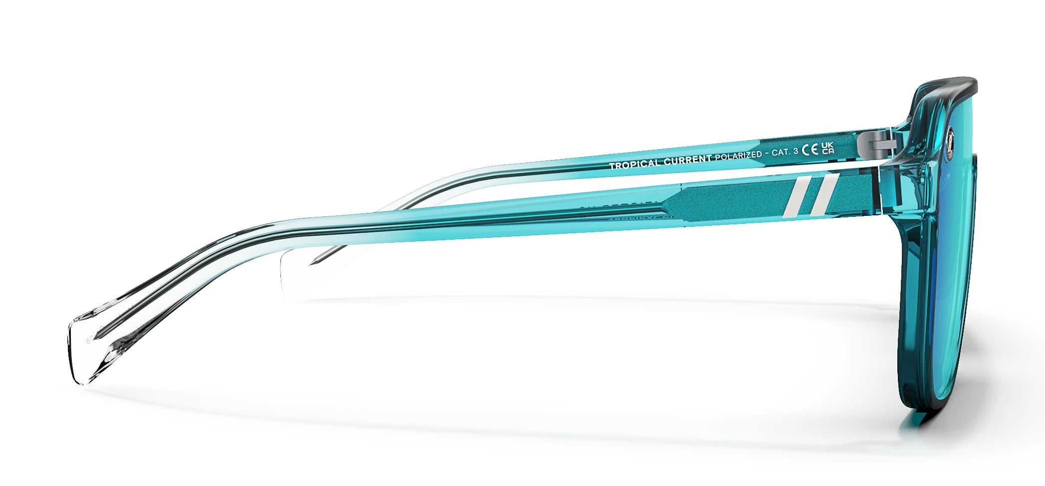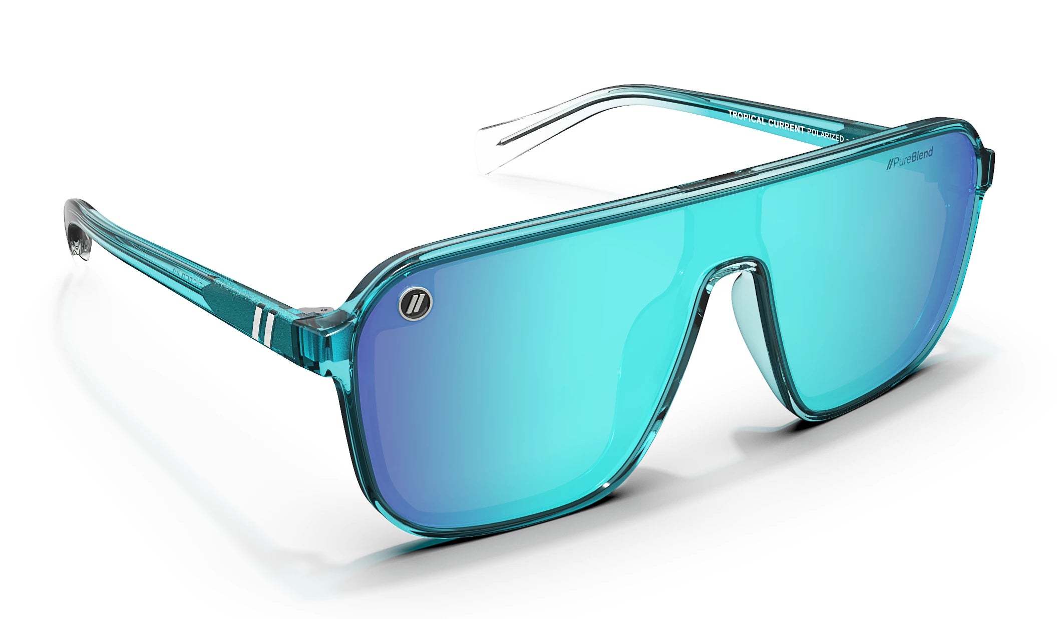 Tropical Current was designed for adventure with a bold edge. A transparent teal frame fading to crystal clear mirrors ocean tones, while a striking blue mirrored PureBlend lens adds style and protection. Durable, confident, and ready for wherever the journey leads.
