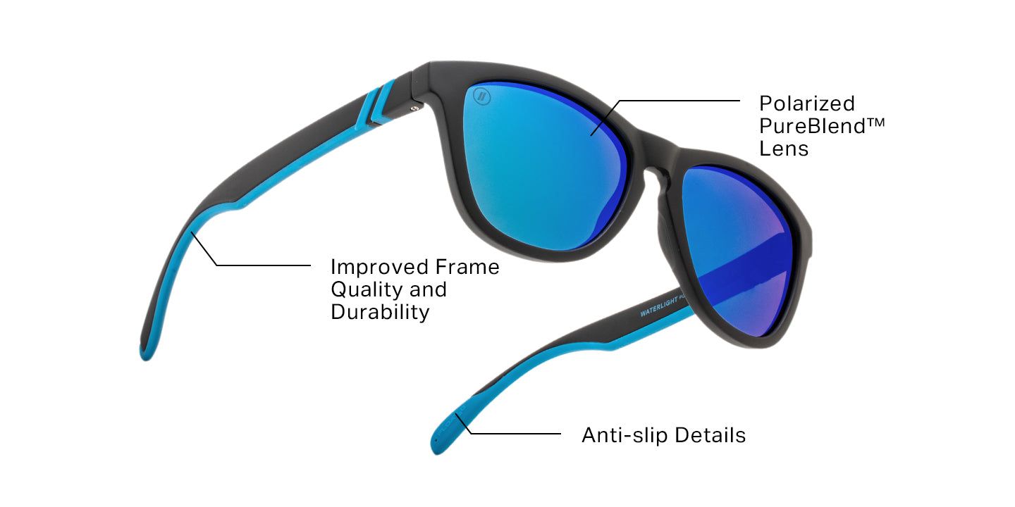 Take the plunge with ‘Waterlight.’ Featuring the sensational Italian-sourced frame material of our ‘Float₂O Pro’ collection, these polarized sunglasses are our finest floatable Blenders yet. Durable and lightweight, we’ve added the power of our PureBlend Lens to significantly increase optical clarity and scratch resistance. Malibu Blue accents and rubberized, anti-slip detailing cap off a look that’s always dripping but never watered down. //